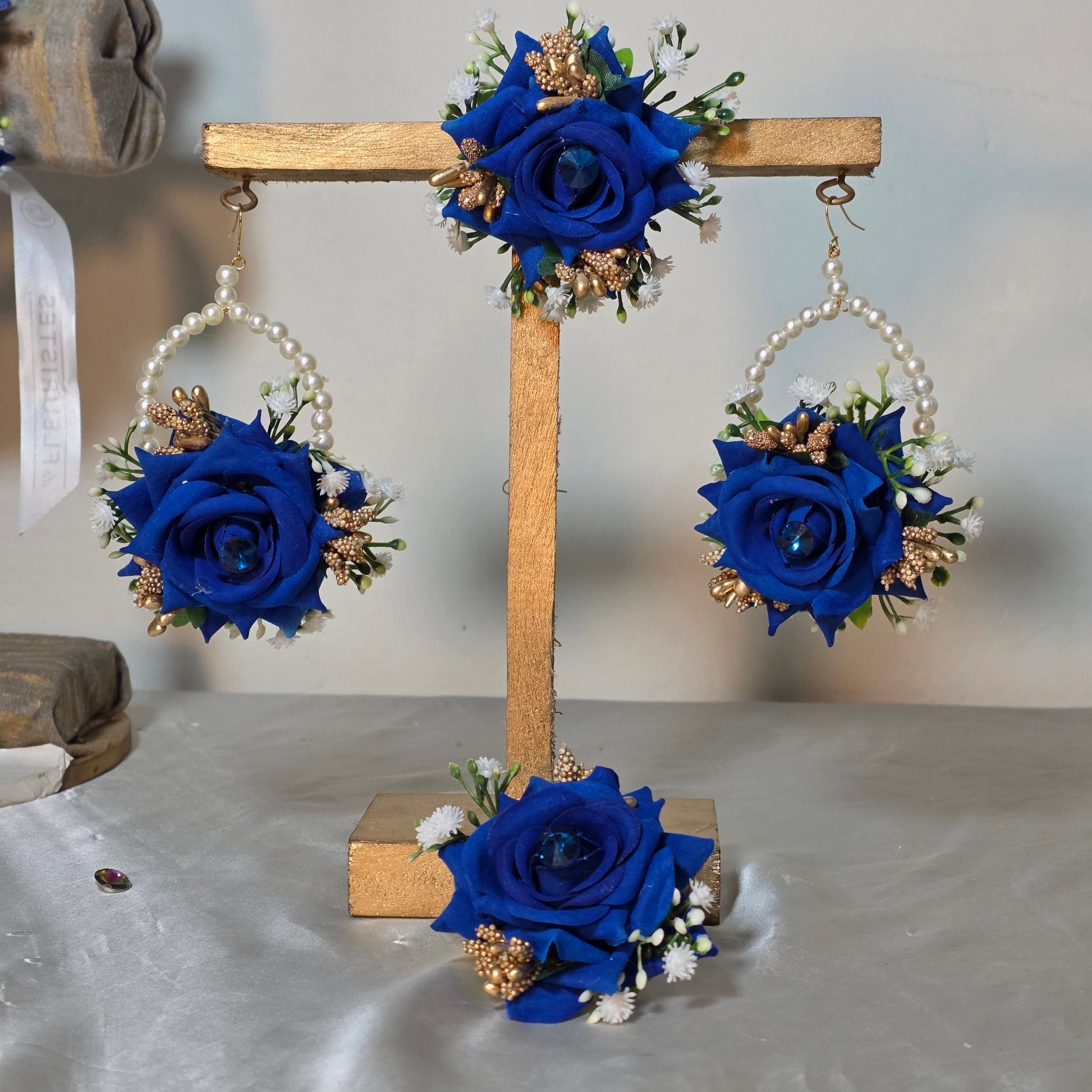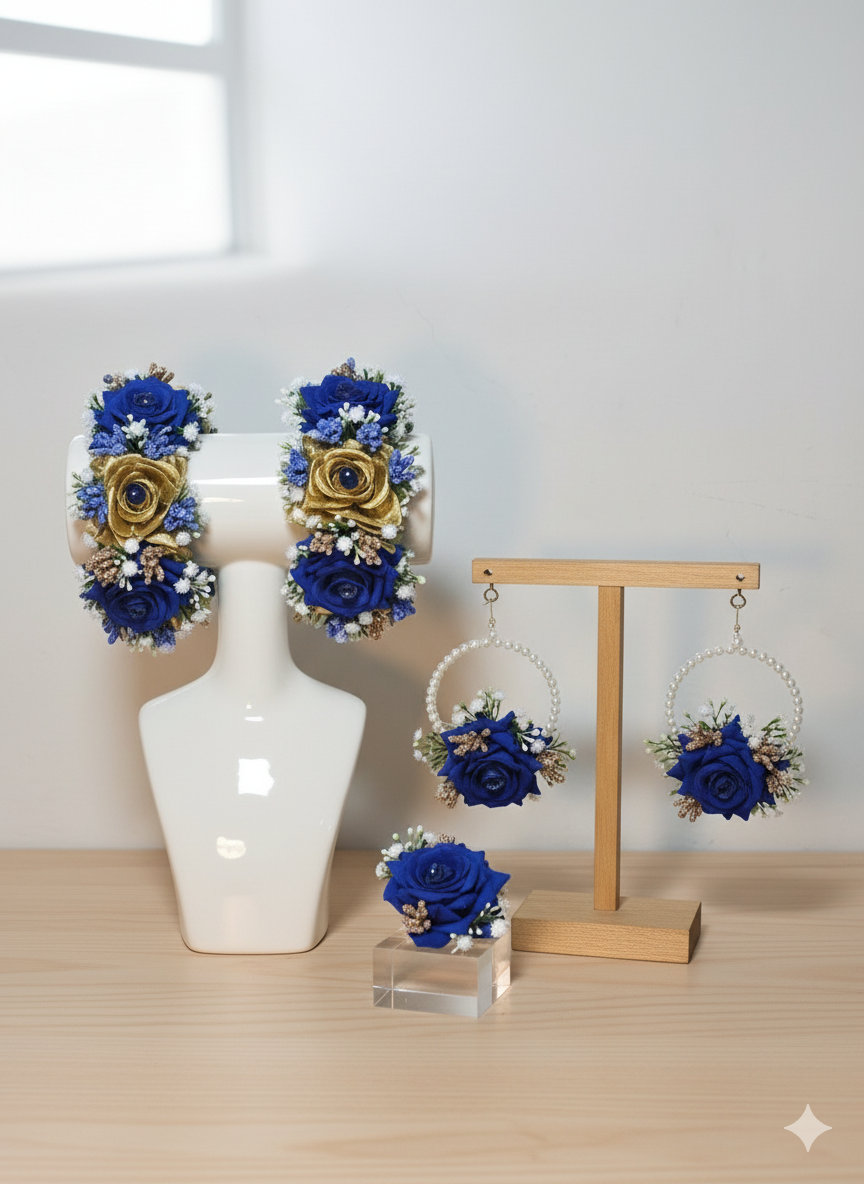 Elevate your style with our premium artificial floral jewelry, Azure Aura. This set includes a beautiful gajra pair for your hands, as well as earrings, a bindi, and a ring. Make a statement and stand out with this unique and elegant accessory.