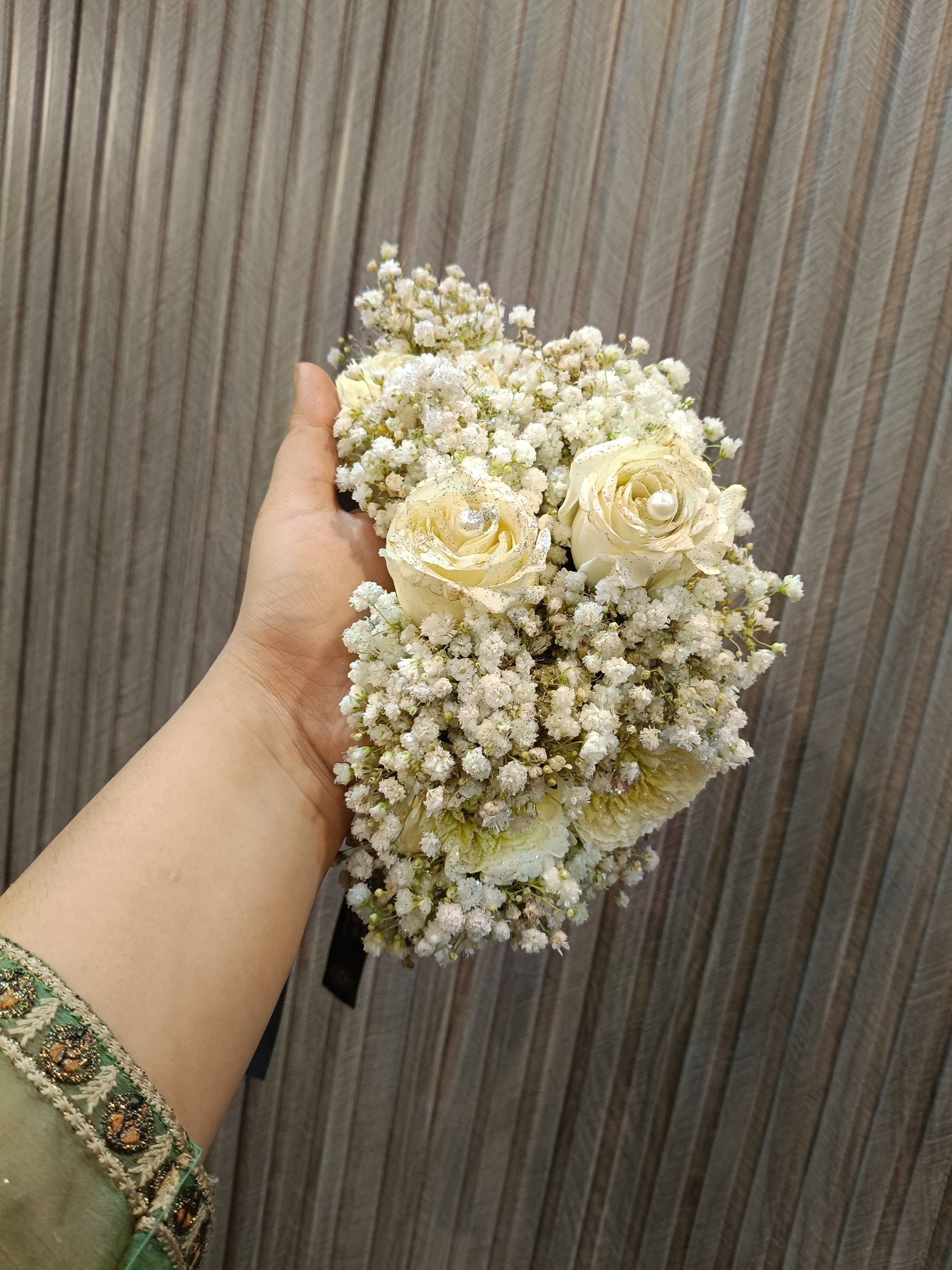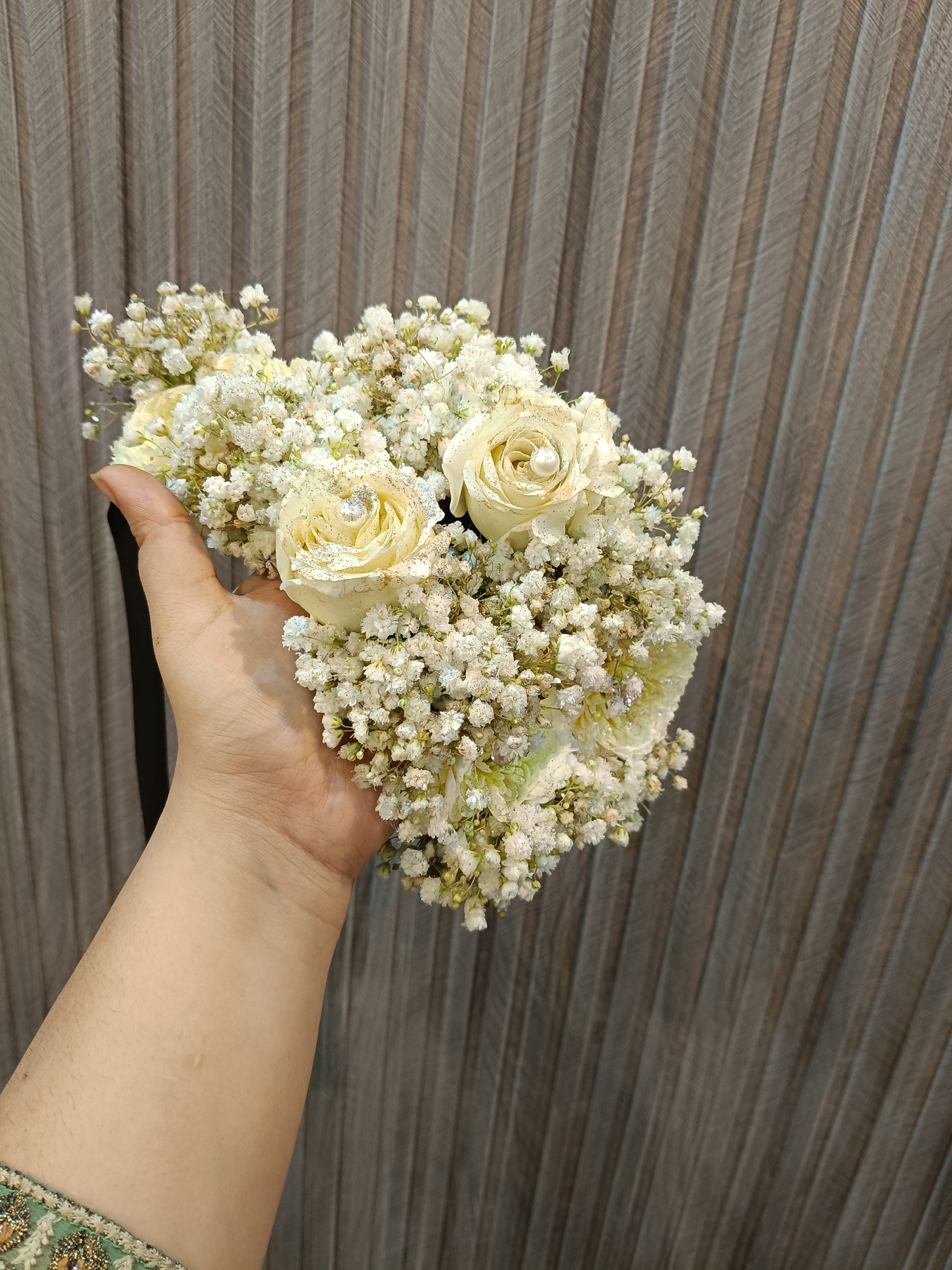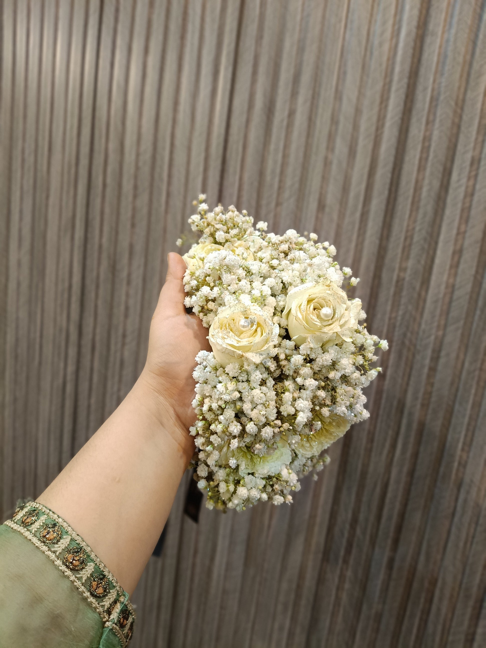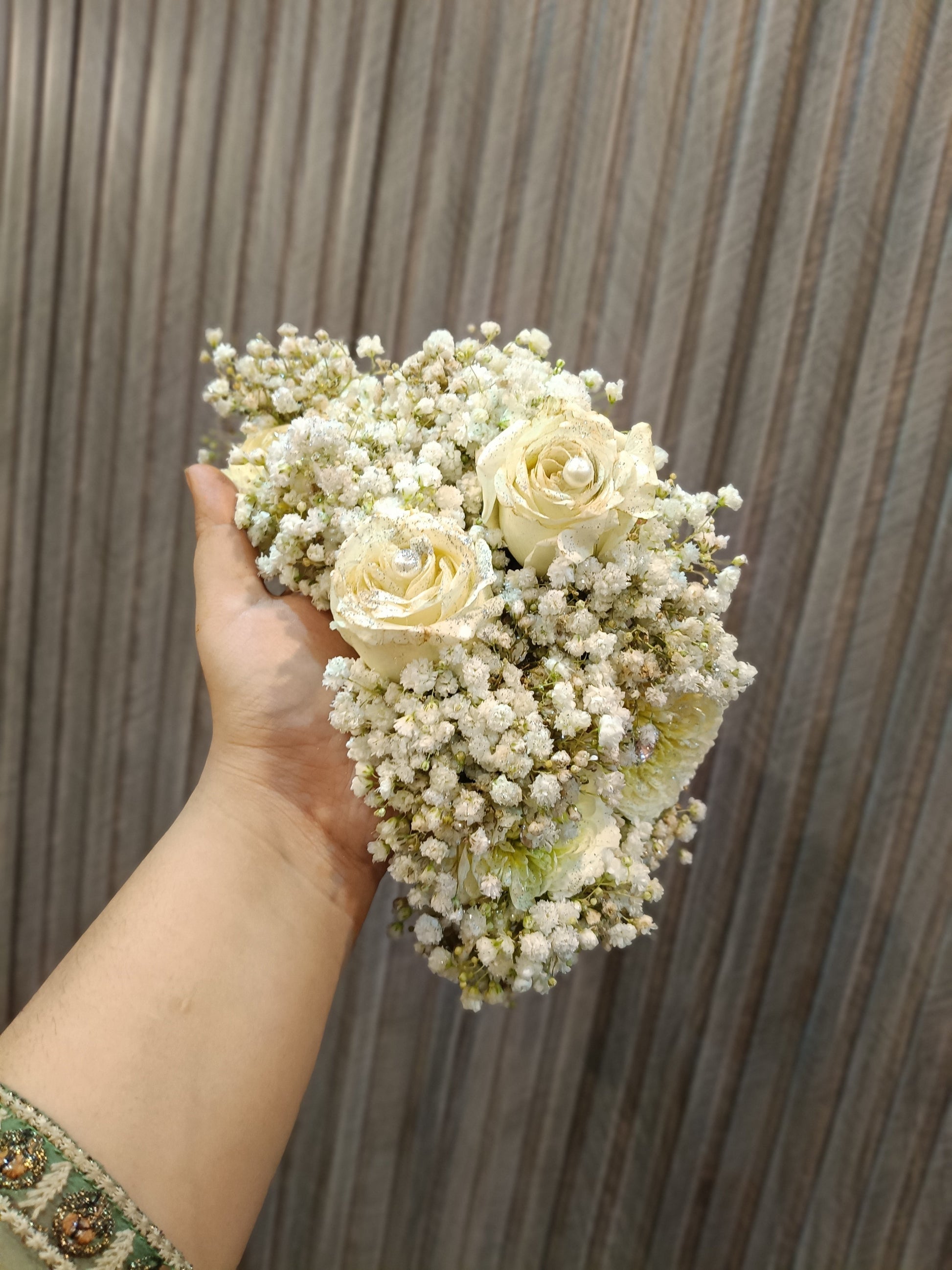 - Delicate white flowers add a touch of romance and whimsy to your bridal look