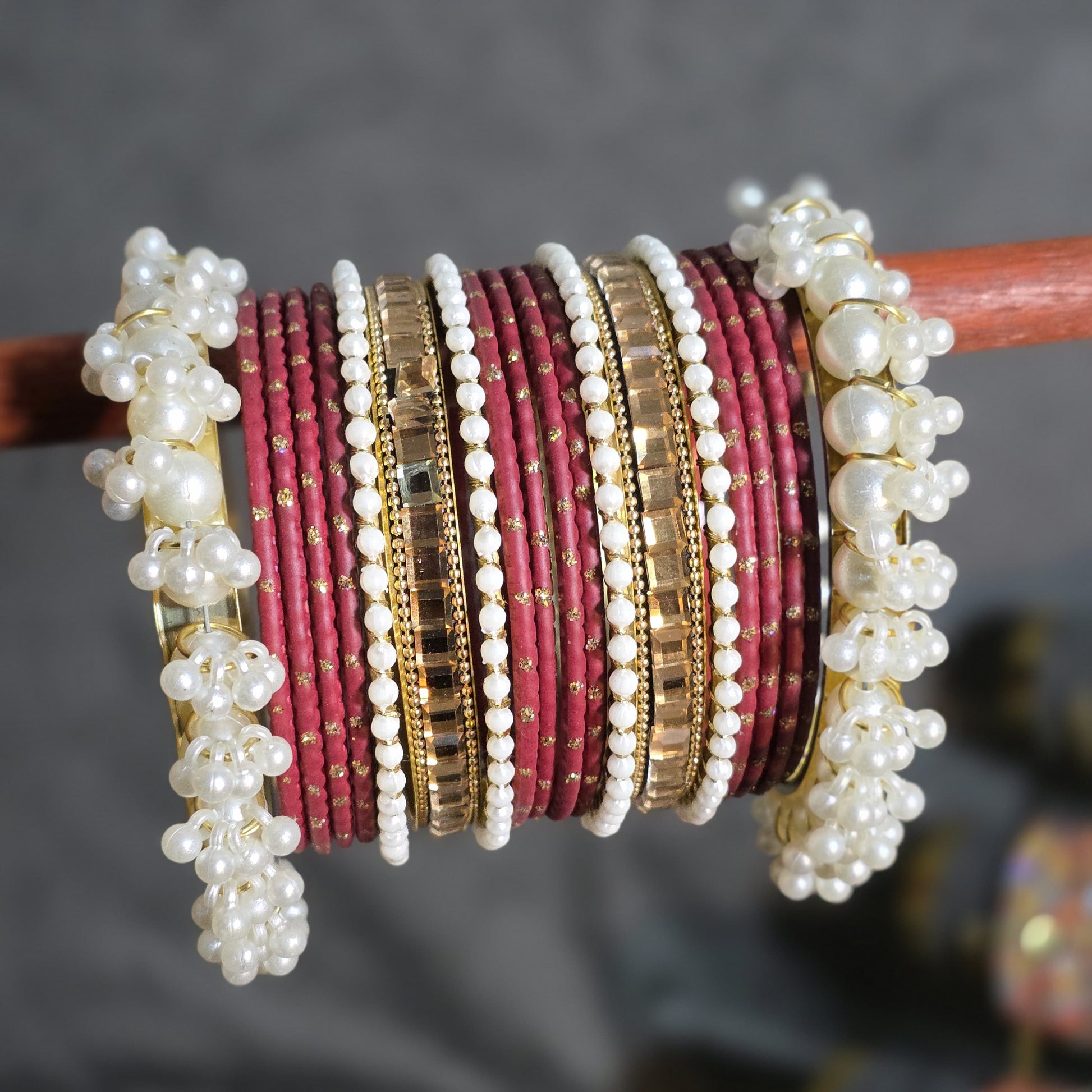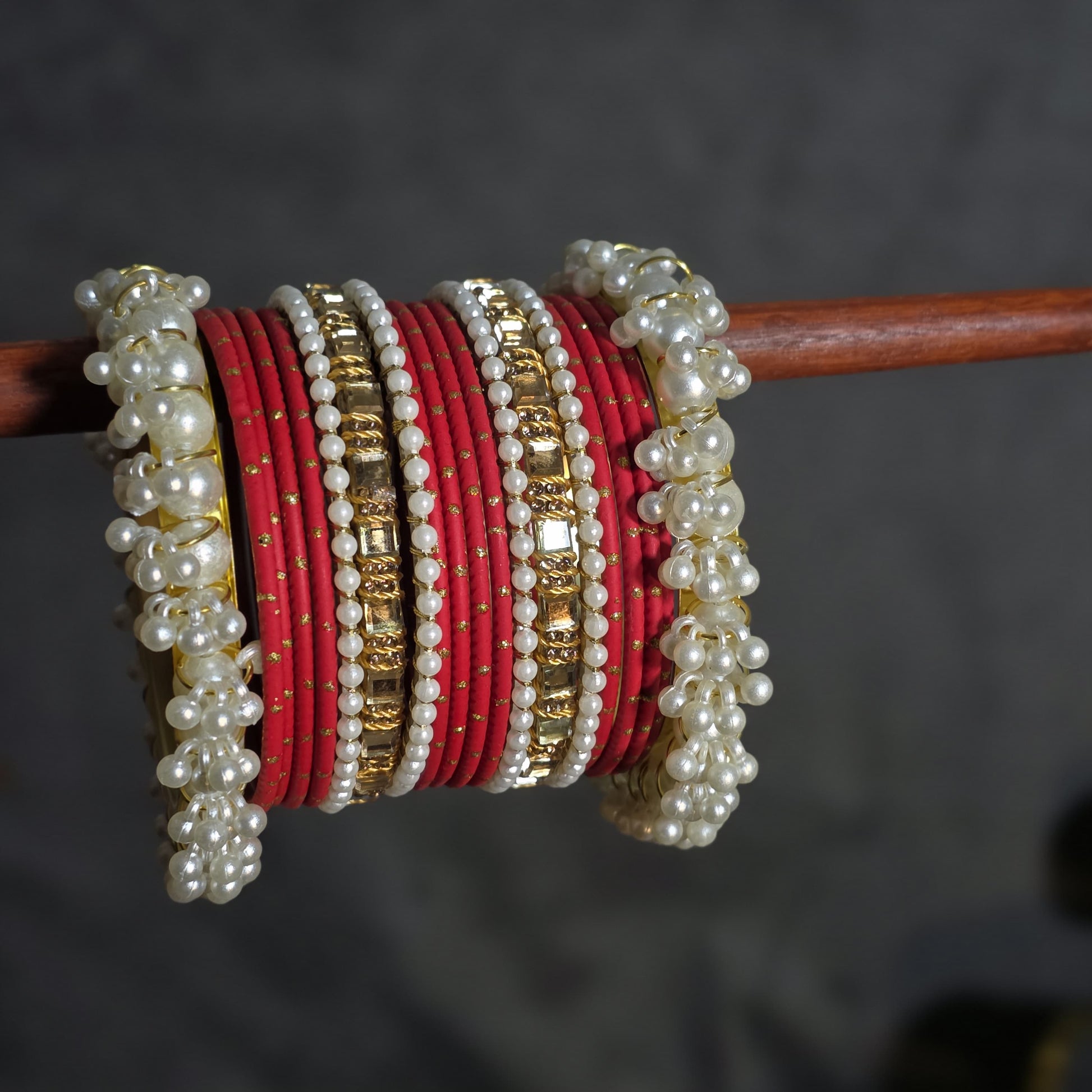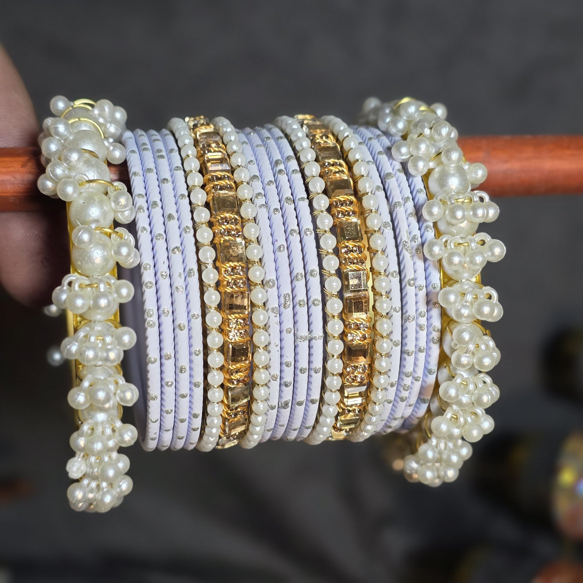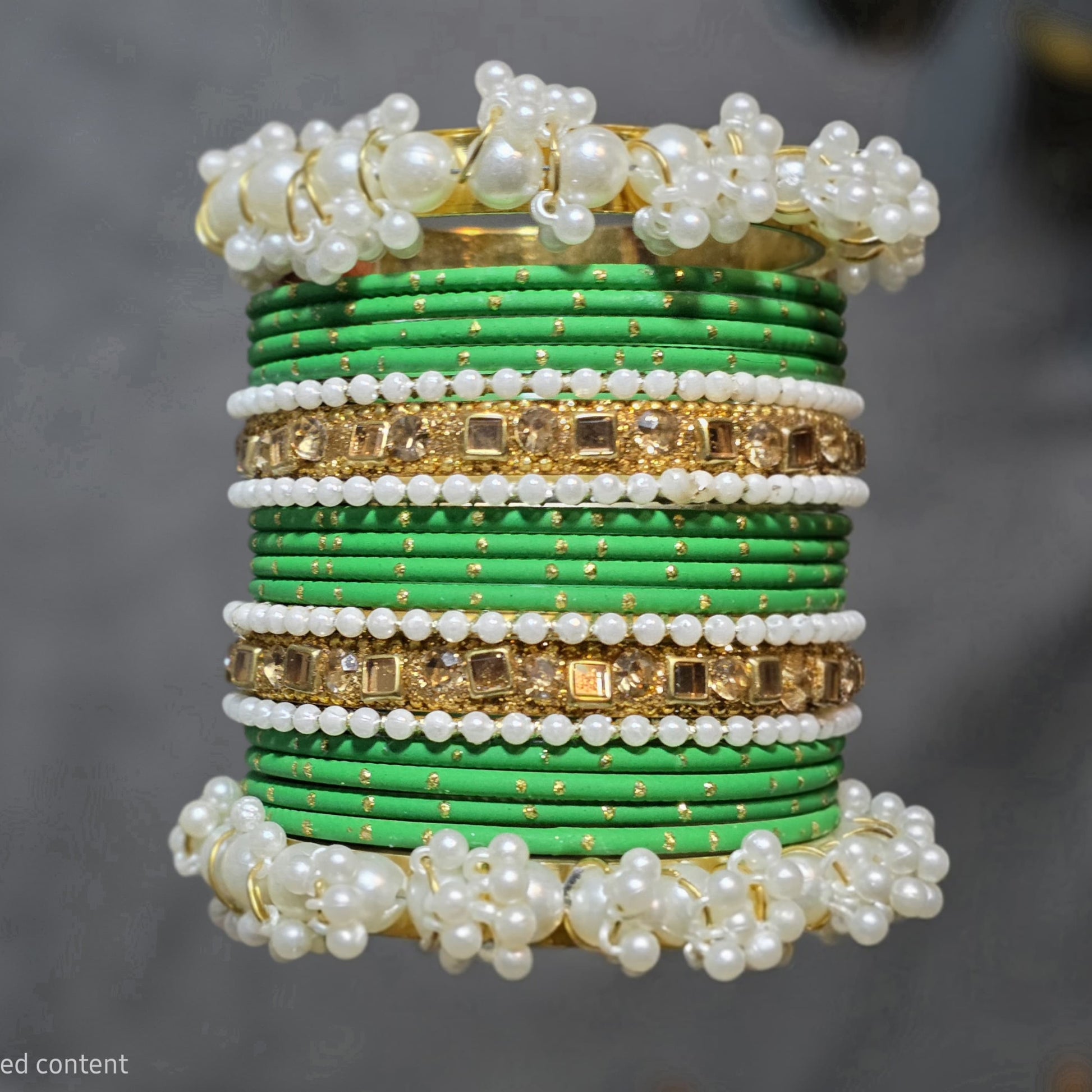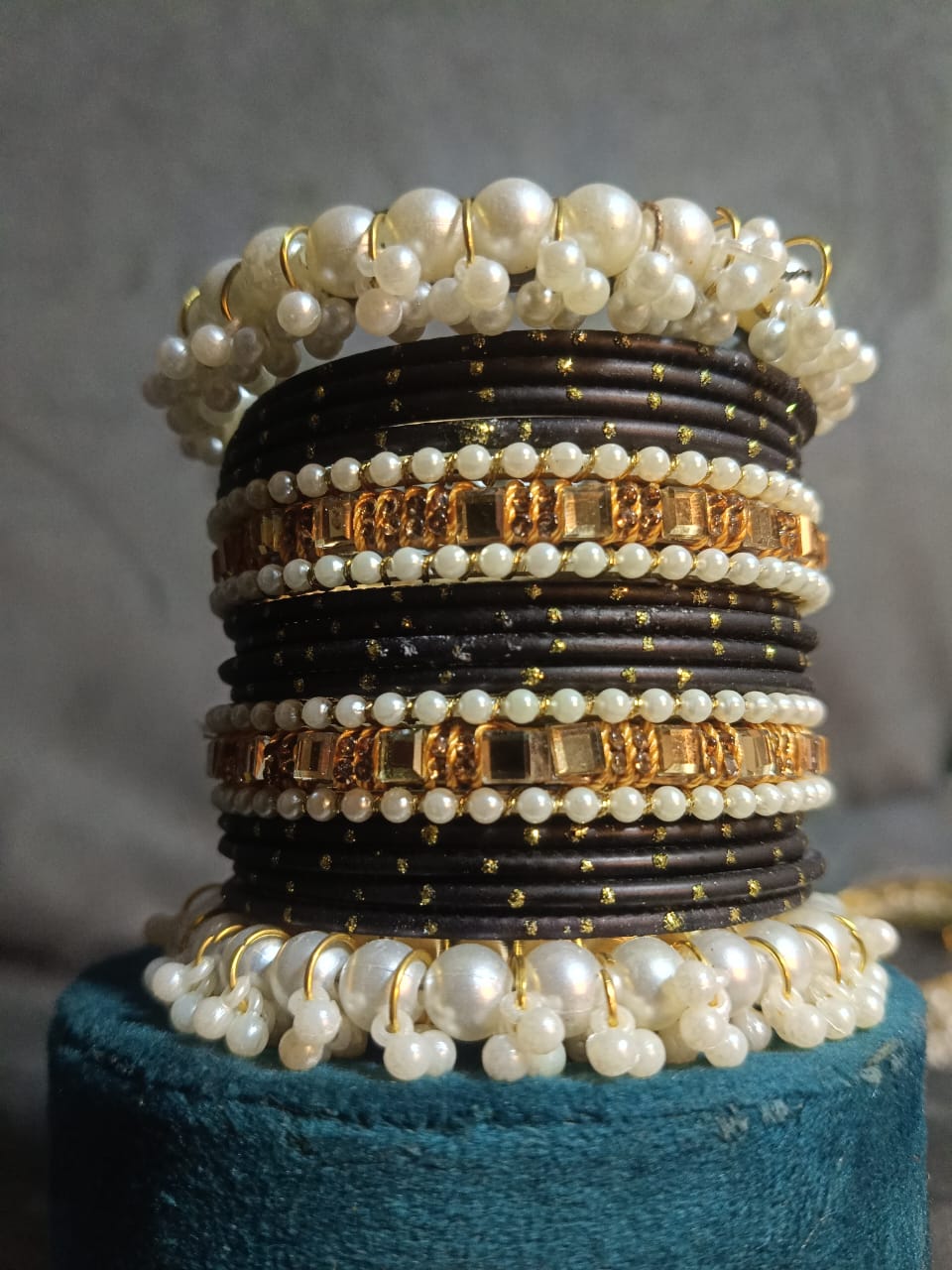 Design: Stacked set with mixed textures (thread, stone, pearl).