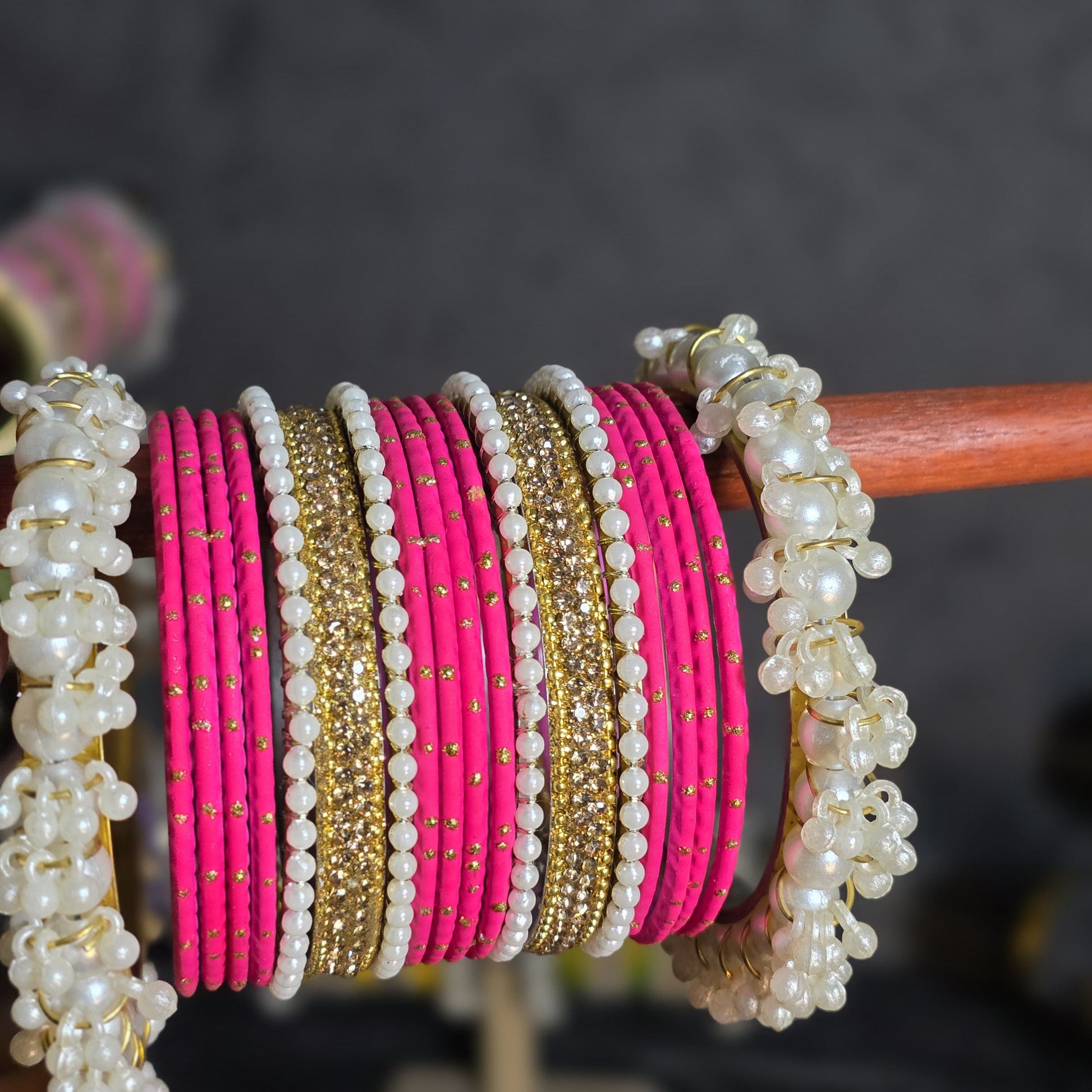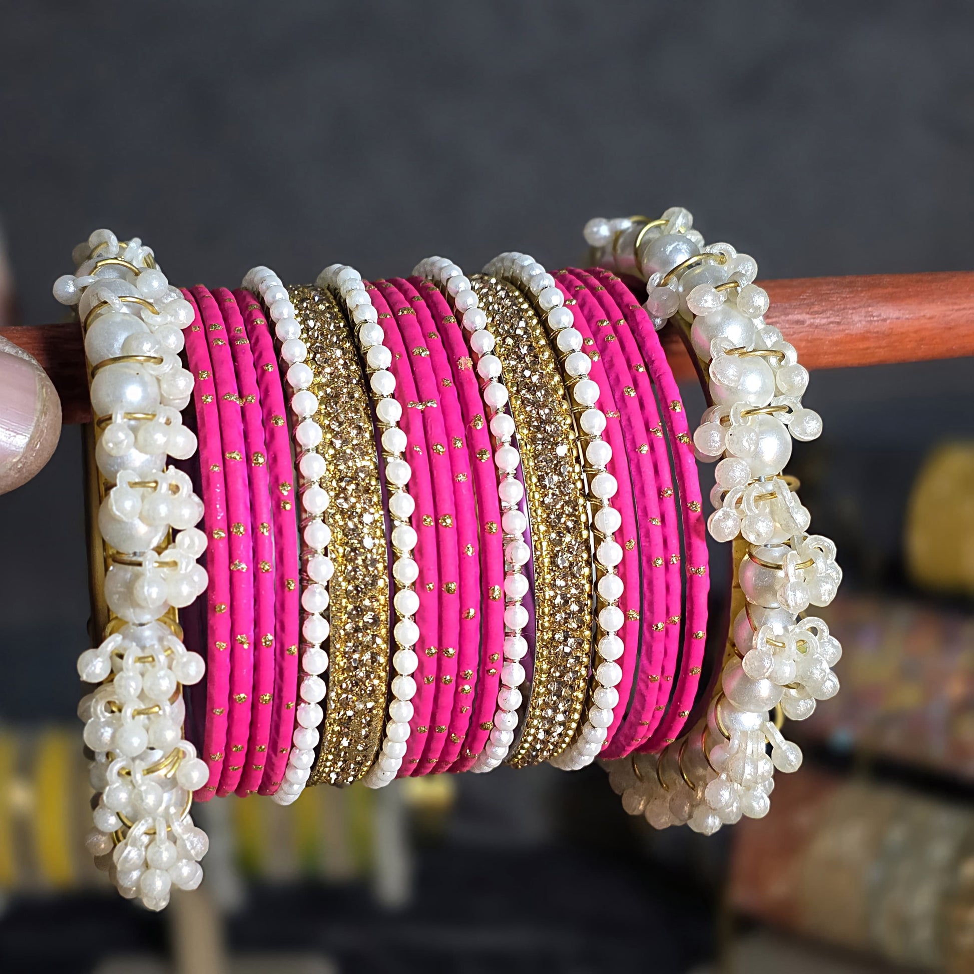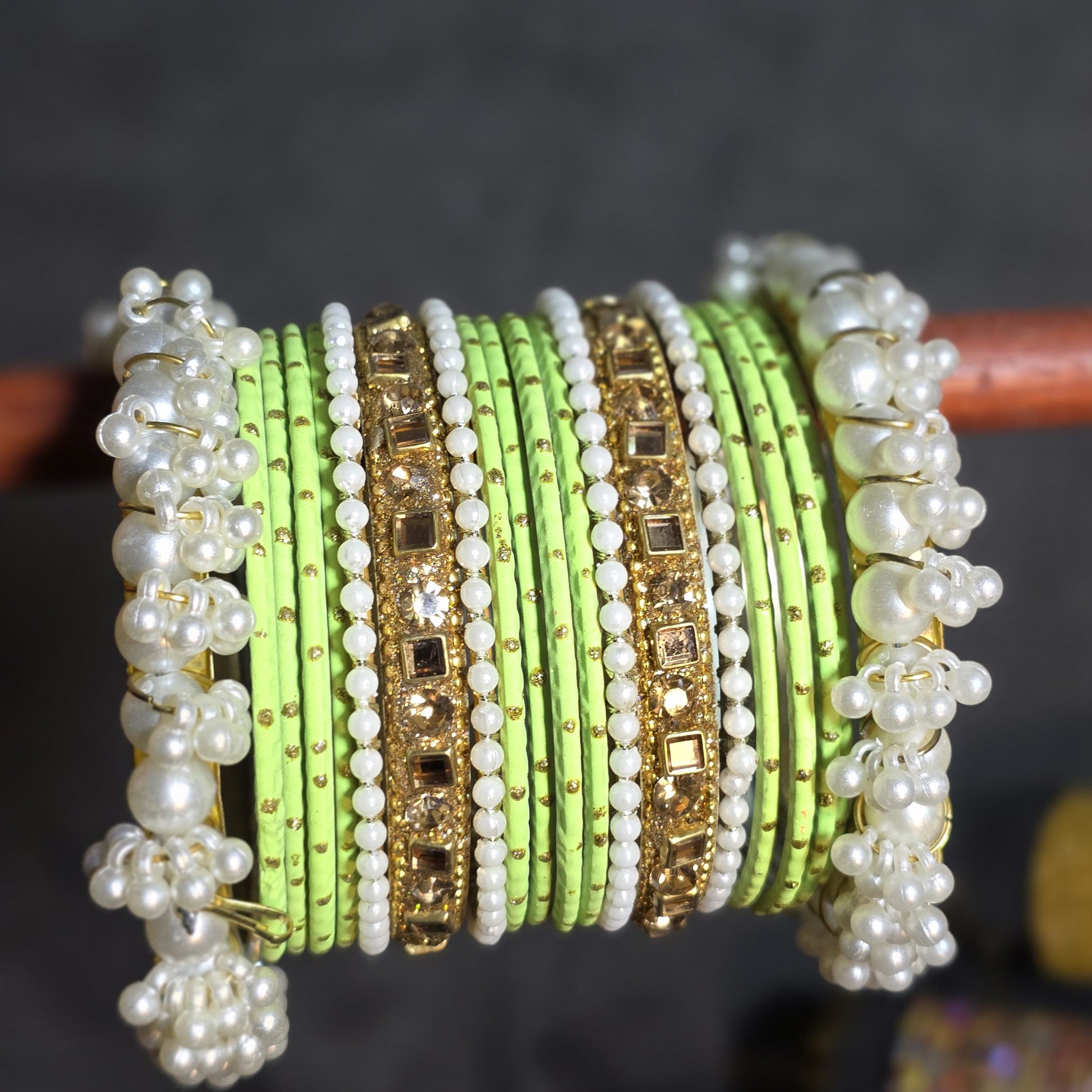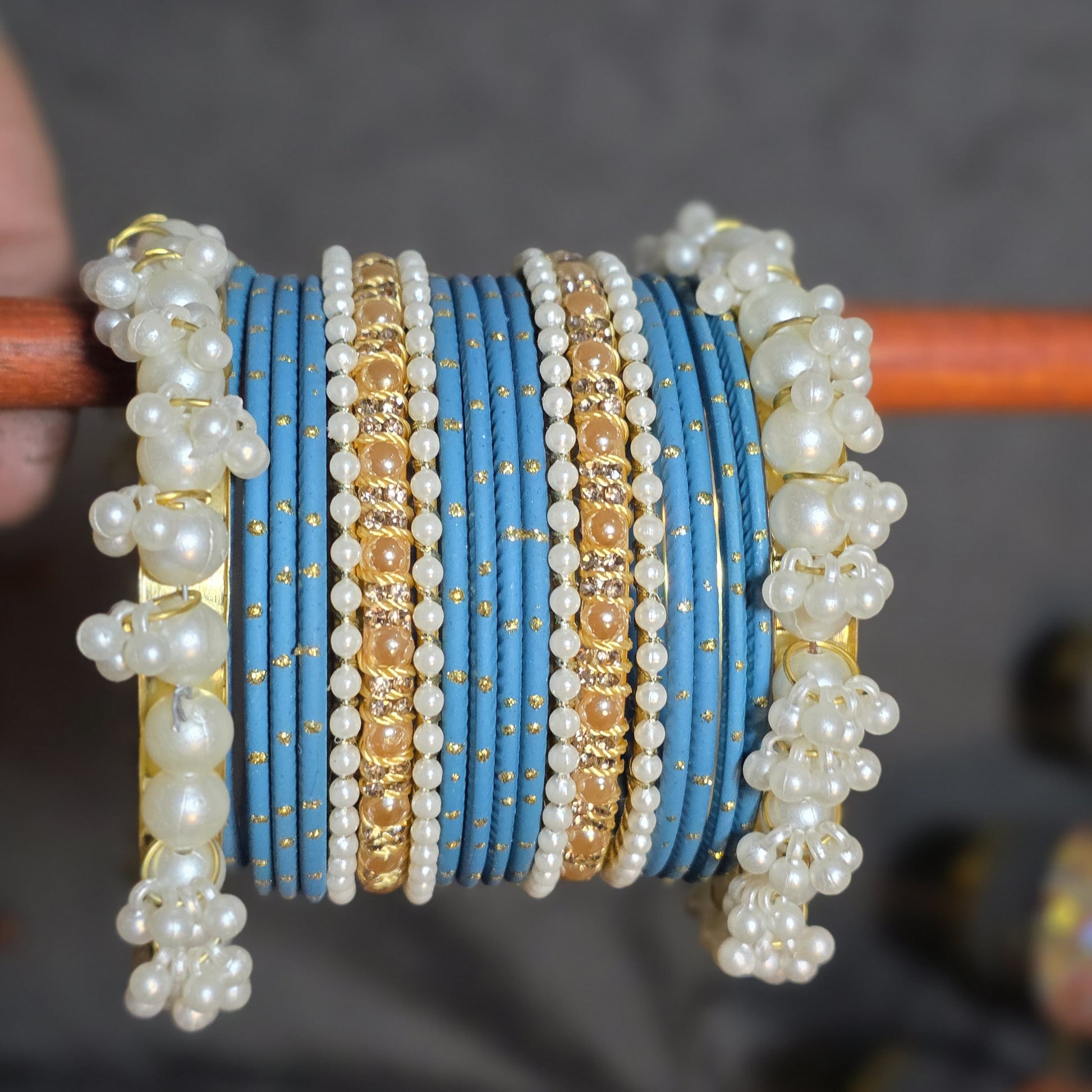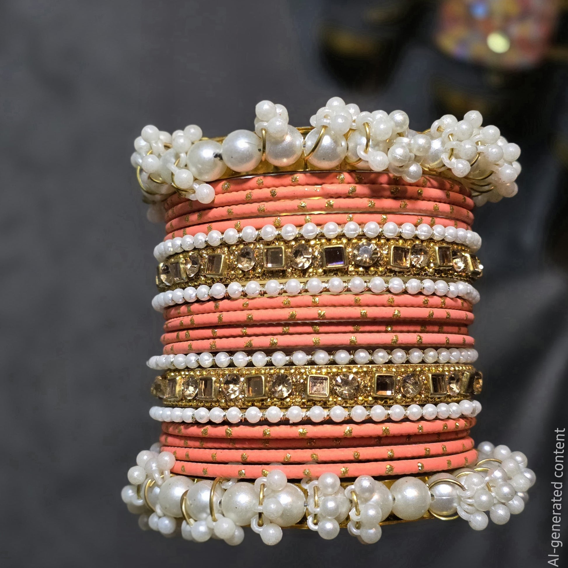 Design: Stacked set with mixed textures (thread, stone, pearl).