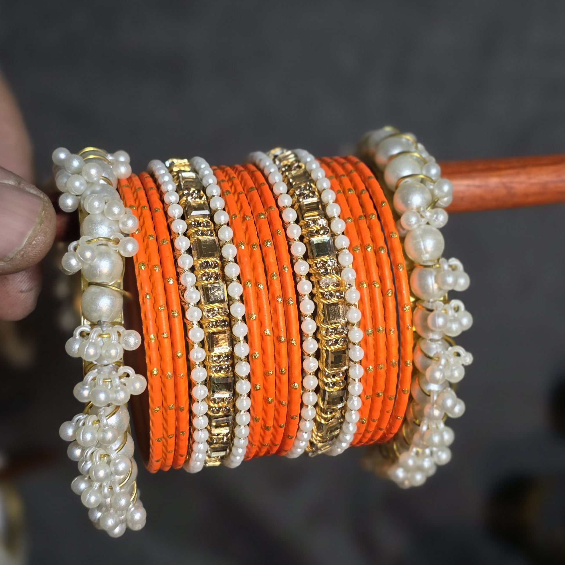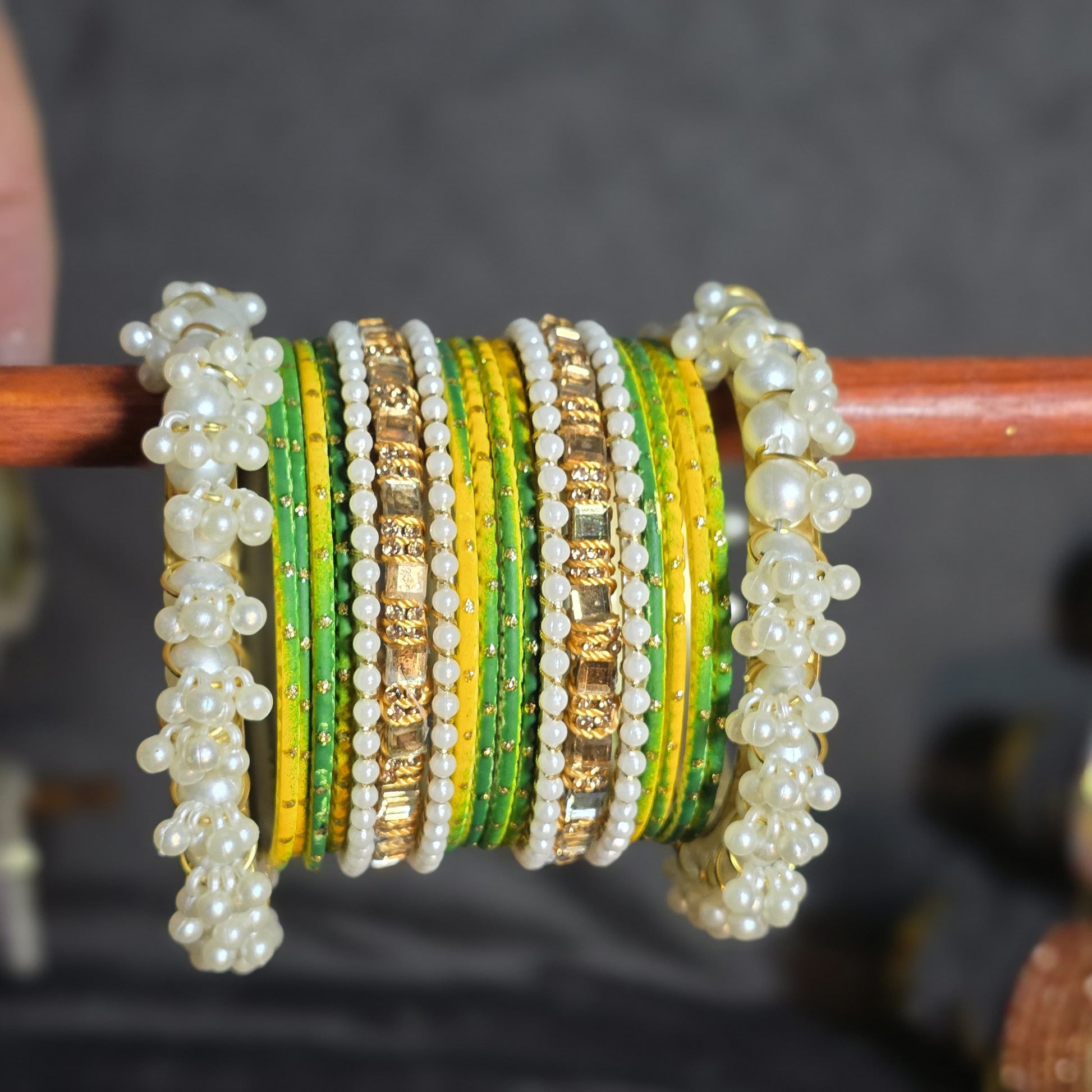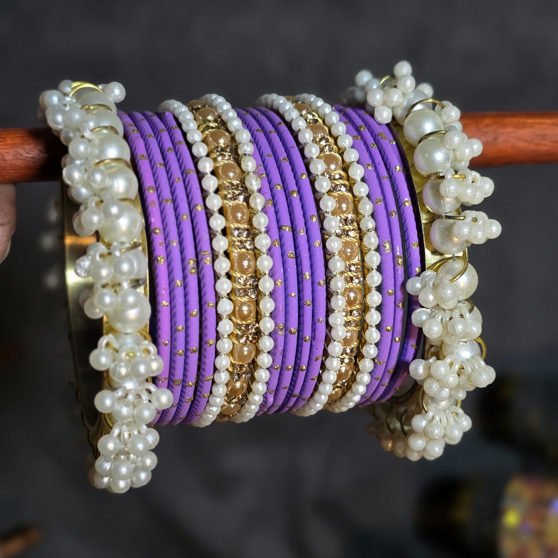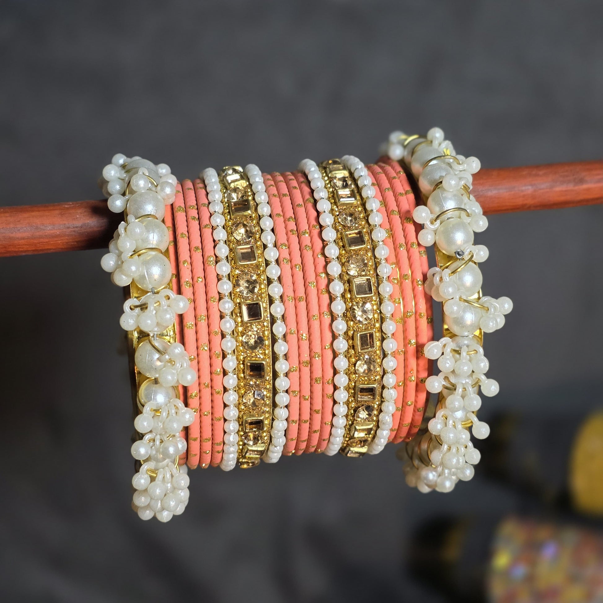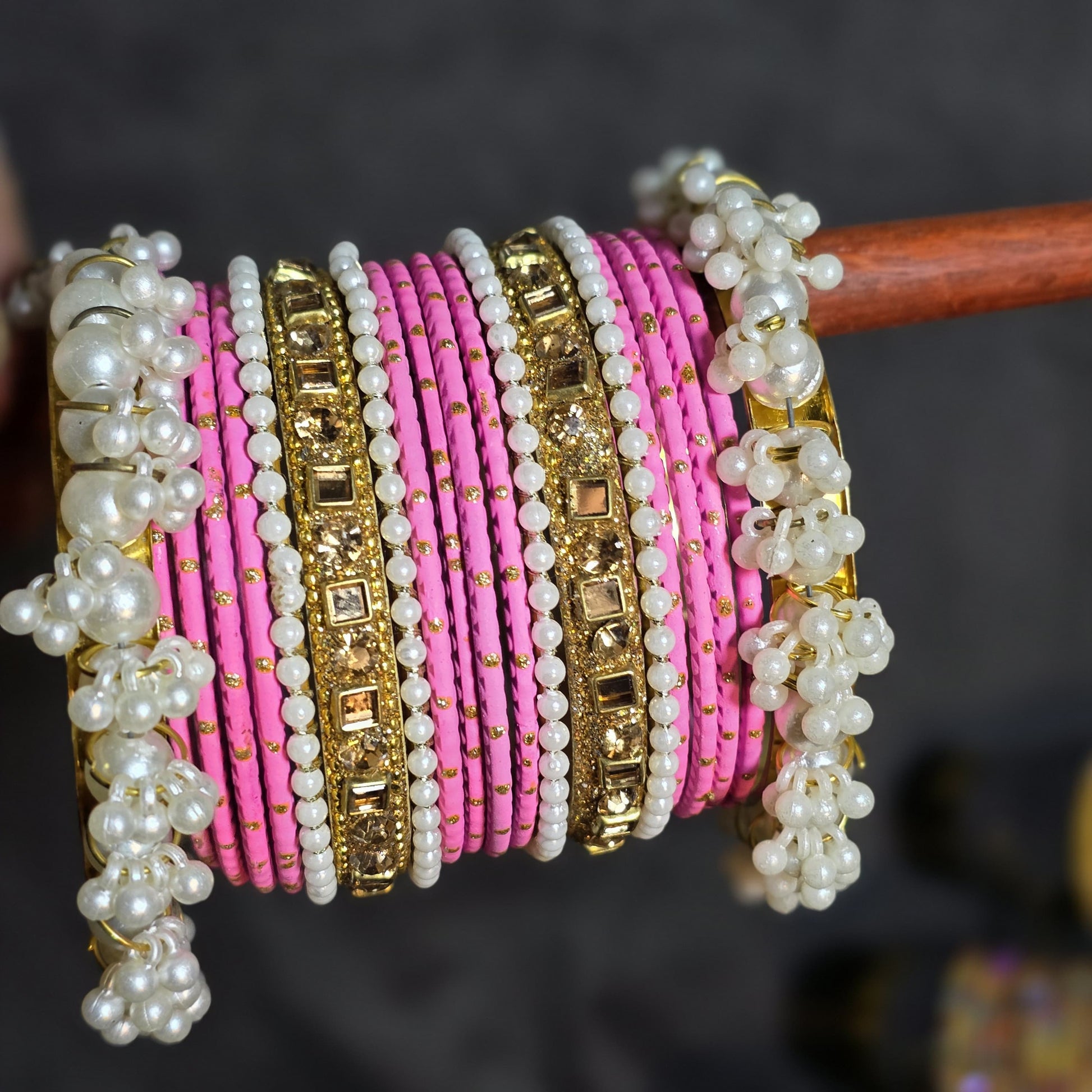 Design: Stacked set with mixed textures (thread, stone, pearl).